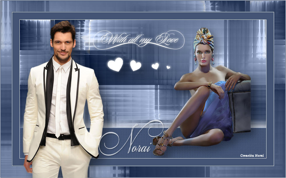 7.- Fusionar capas, cambiar de tamaño a 80%, imagen agregar bordes de 1 pixel color #ffffff, imagen agregar bordes de 25 pixeles color #435474, imagen agregar bordes de 1 pixel color #ffffff, imagen agregar bordes de 40 pixeles color #435474, imagen agregar bordes de 1 pixel color #ffffff, abrimos el tube 2232-david-gandy- LB TUBES, copiar y pegar como nueva capa, cambiar de tamaño un 80%, colocamos la misma sombra anterior, abrimos el pincel lo exportamos a pincel personalizado, colocamos como primer plano color #ffffff, abrimos el pincel, tamaño 329, paso 32.- Colocamos nuestra marca de agua y la autoría, guardamos en formato JPG. Esperando que les guste!!